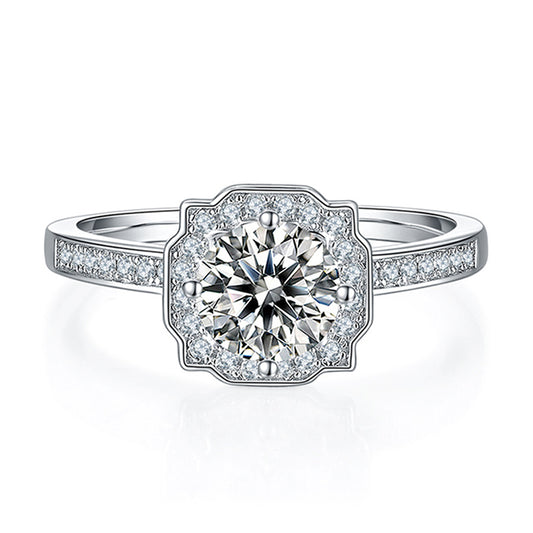 1 Carat Moissanite Hexagon Halo Ring - 925 Sterling Silver Six-Prong Engagement Jewelry