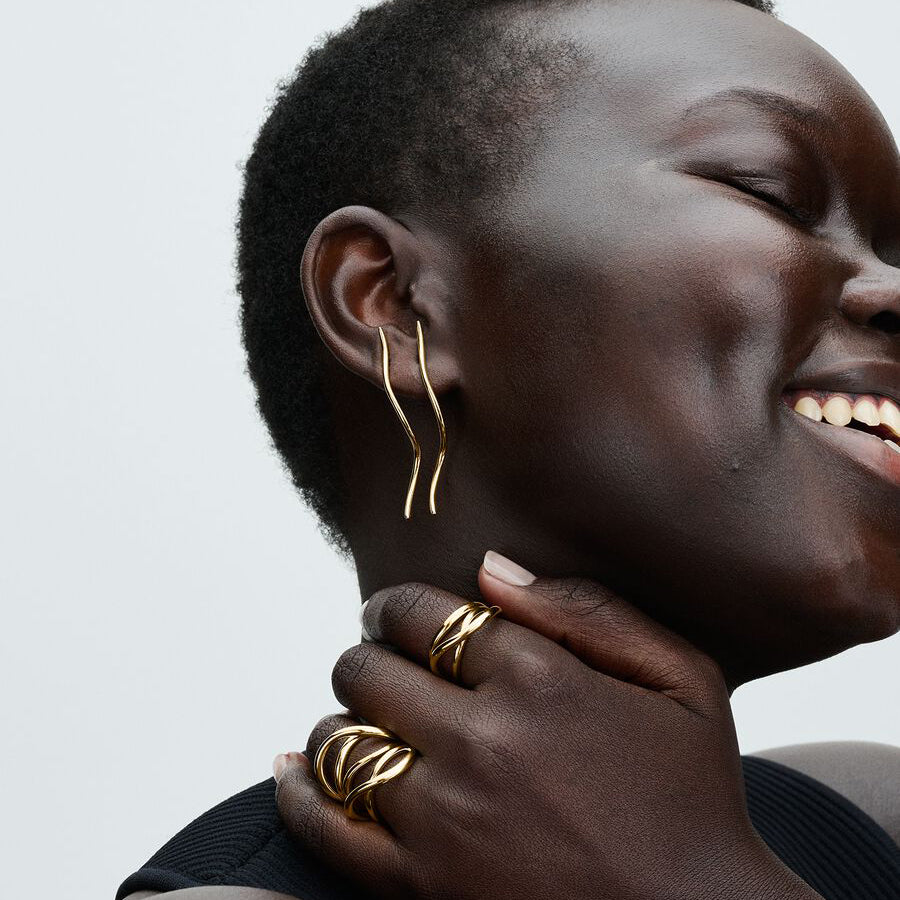 Redefine your earring collection with these innovative organically-shaped wire stud earrings in luxurious 14k gold plating. Blending the simplicity of studs with the elegance of drop earrings, each piece features a softly curved wire that extends below the earlobe, inspired by nature's imperfect beauty. The warm gold plating enhances the fluid, contemporary design while complementing all skin tones. Measuring 52.2mm in length, these lightweight yet statement-making earrings offer versatile wearability for both casual and formal occasions. A perfect choice for those who appreciate jewelry that combines minimalist aesthetics with artistic flair.