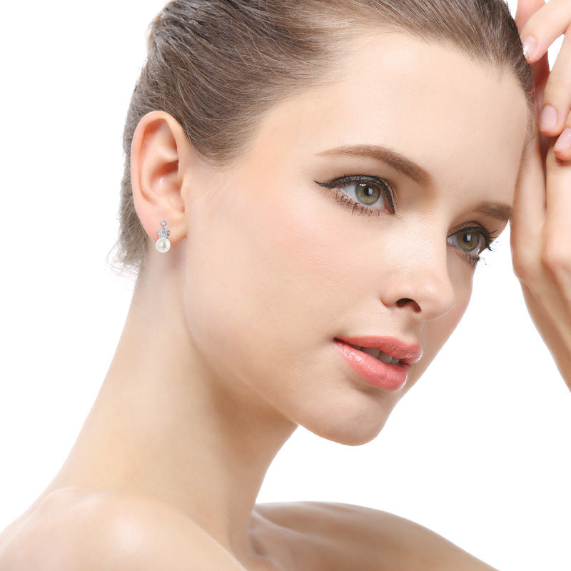 Royal-Inspired Korean Pearl Stud Earrings - 925 Silver with Crown Motif