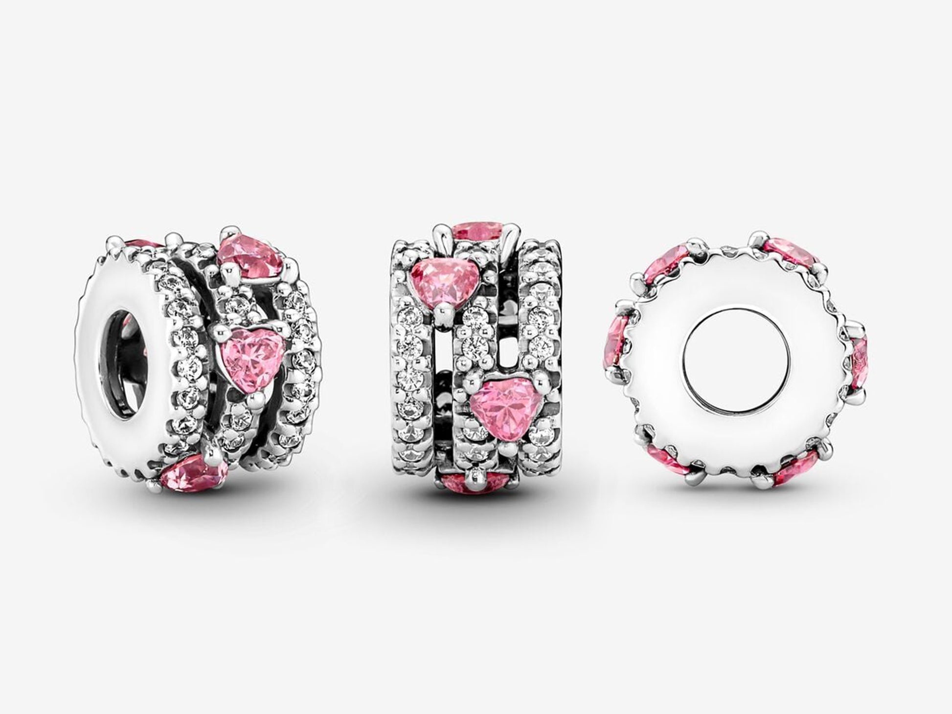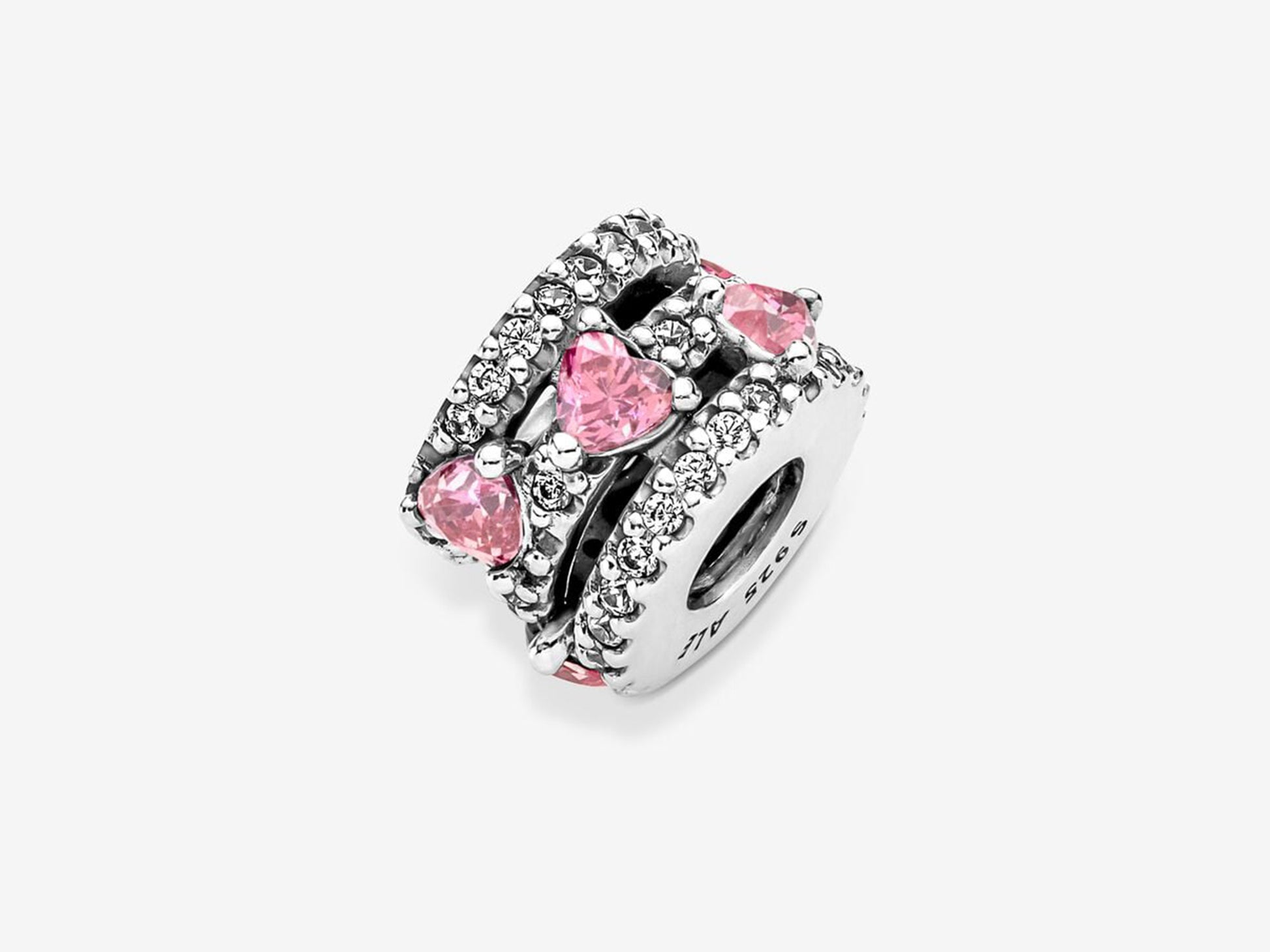 Experience the enchantment of the Triple Heartshine Charm for Pandora Bracelets from the Timeless Collection. Crafted in 925 silver, this charm features a captivating design with three pavé-encrusted rings, adorned with six prong-set heart-shaped iridescent pink cubic zirconia and 47 brilliant-cut transparent cubic zirconia. The hearts, strategically placed in a staggered formation, add a touch of sophistication and three-dimensional allure. The polished sides enhance its overall elegance, making it a perfect addition to your timeless collection.