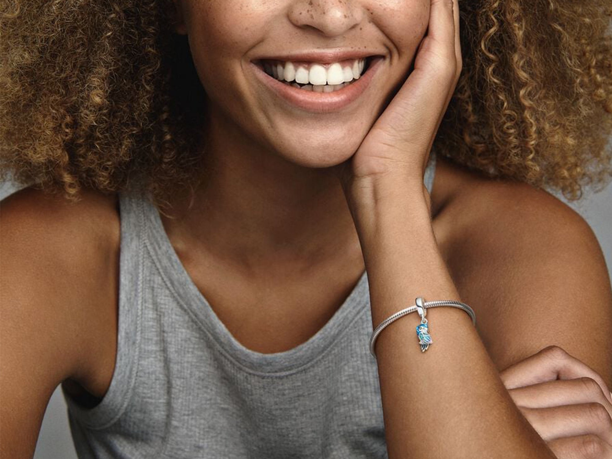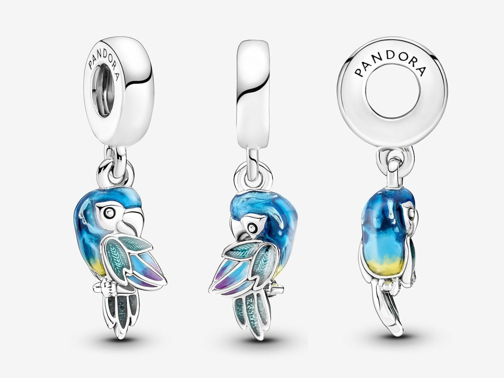 Evoke the exotic allure of the jungle with our Pandora Jungle Paradise Parrot Charm. Crafted in sterling silver, this 3D parrot charm features exquisite enamel detailing in shades of transparent French blue, bluebird blue, deep purple, transparent pine green, and transparent yellow. The parrot's feathers exhibit a gradient effect, and its wings are intricately designed with silver accents that mimic the texture of real feathers. The parrot's head is playfully tilted to the side, adding a touch of whimsy to its lifelike appearance. This charm is the perfect addition to your Pandora Moments collection, capturing the essence of a tropical dream.