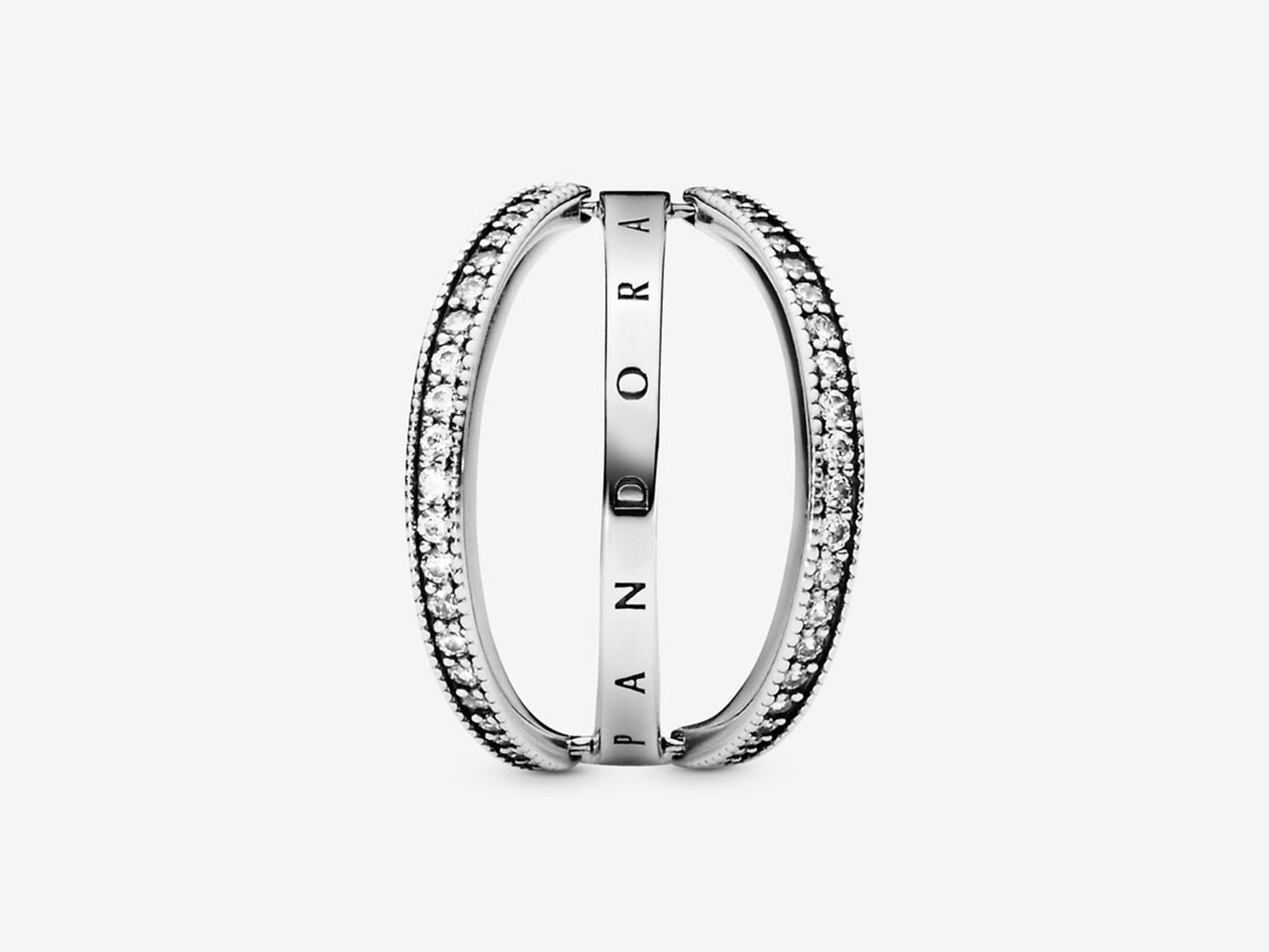 Create multiple looks with just one reversible ring in sterling silver, detailed with our logo and signature hearts. The hand-finished band ring features two lines of clear cubic zirconia that flip from side to side, so that you change up the look to suit your mood. Style the reversible piece with the Pandora logo or the cut-out hearts, you decide. Wear it solo for a statement look or as part of a ring stack with similar styles.