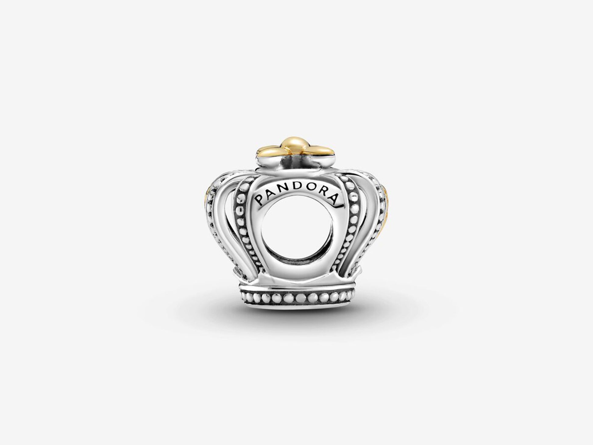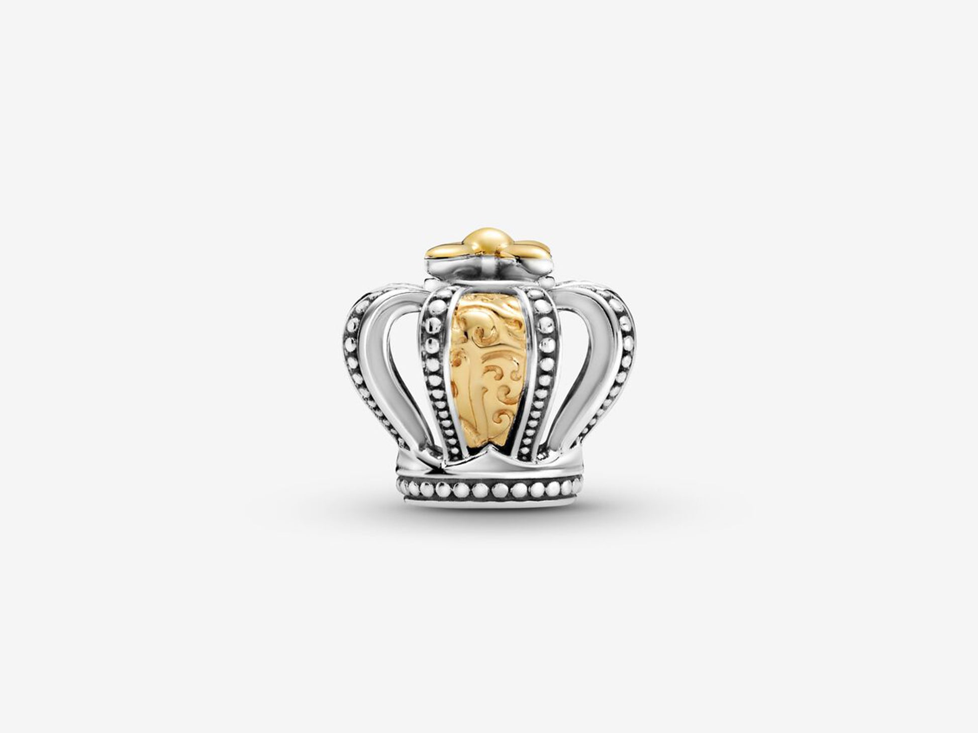 Adorn yourself with the opulent Two-Tone Crown Charm, reminiscent of royal accessories. This handcrafted masterpiece is a combination of 925 silver and 14K gold, featuring a 3D crown with a 14K gold marquise-cut flower atop, and two 14K gold sides adorned with intricate rotating details and floral patterns. Small beading along the edges and a gold logo tag at the bottom make this finely detailed crown charm even more eye-catching. Wearing this charm adds a touch of regal elegance to any outfit.