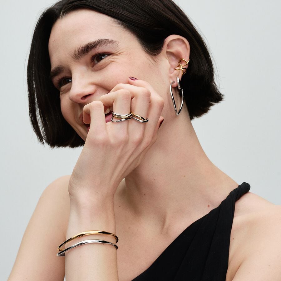 Part of the Essence collection, this two-tone ring offers exceptional versatility - you'll never have to choose between silver or gold again. The fluid, organic shape of the entwined bands makes this piece a standout addition to any jewelry collection. Wear it alone for a minimalist statement or layer it with other rings for a more dramatic effect.