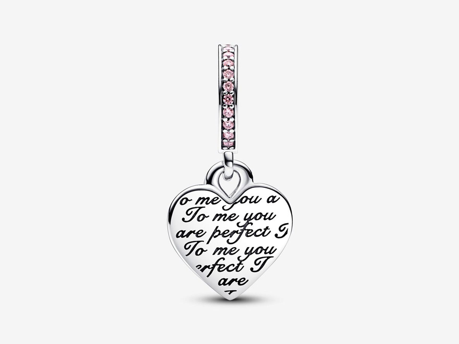 A jewelry gift for a mom who will always be perfect to you, just as she is. The Two-tone Infinity Heart Double Dangle Charm features an openwork heart dangle in 14k rose gold plating forming an infinity symbol in the center, adorned with a row of pink pavé and engraved with the word "Mom" with a pink stone as the central letter. Behind it is a sterling silver heart-shaped disc engraved with the message "To me you are perfect" creating a repeating pattern on both sides. Pink pavé on the bail adds a finishing touch. A celebration of motherly love in all its forms.
