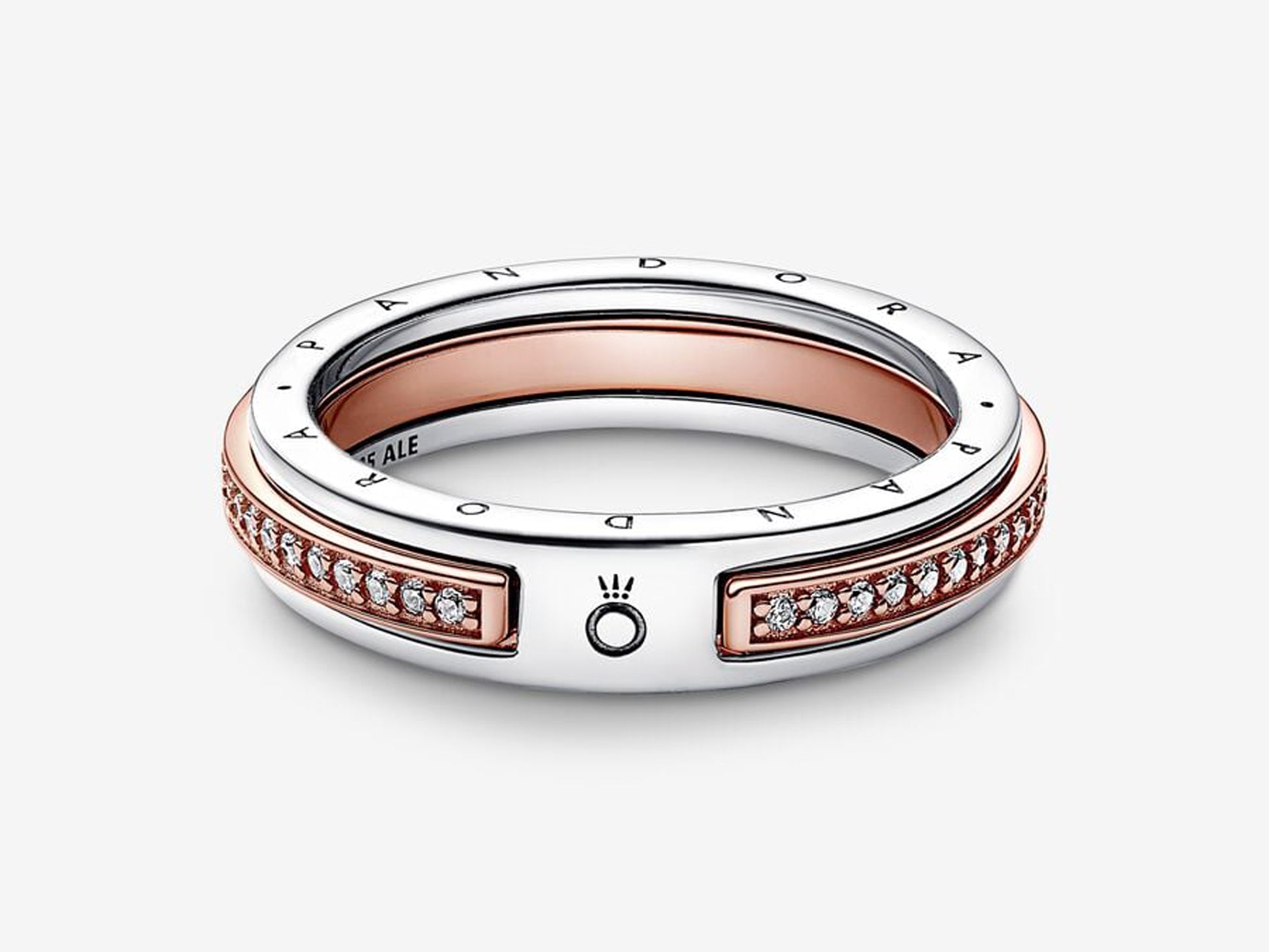 Build your ring stack with the Pandora Signature Two-tone Logo & Pavé Ring. With a two-tone square profile band, this ring has a slightly raised 14k rose gold-plated design running almost all the way around with sparkle in its center. The back of the ring is engraved with the Pandora Crown O, creating a small gap in the rose gold band. A staple for any jewelry collection, this statement ring stands out on its own or in a perfectly curated stack.