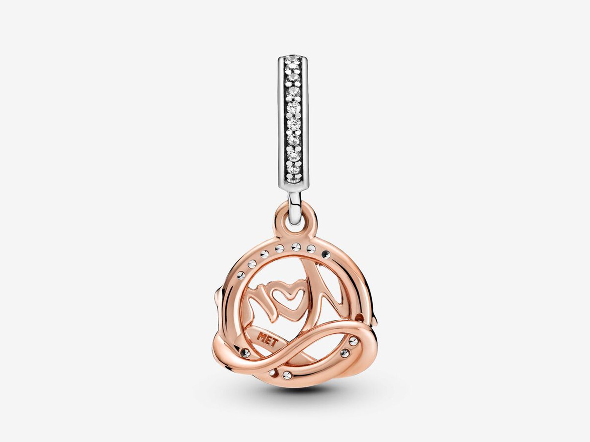 Inspire her to shine bright with the Two-tone Mum Dangle Charm. Hand-finished in sterling silver and 14k rose gold-plated metal, this openwork dangle includes a “Mum” script, with the “U” replaced by a heart. The surrounding circle is decorated with stones and beading, with an infinity symbol twisted around the bottom. A row of cubic zicronia features on the bail. Gift your mum this piece as a gesture of love.