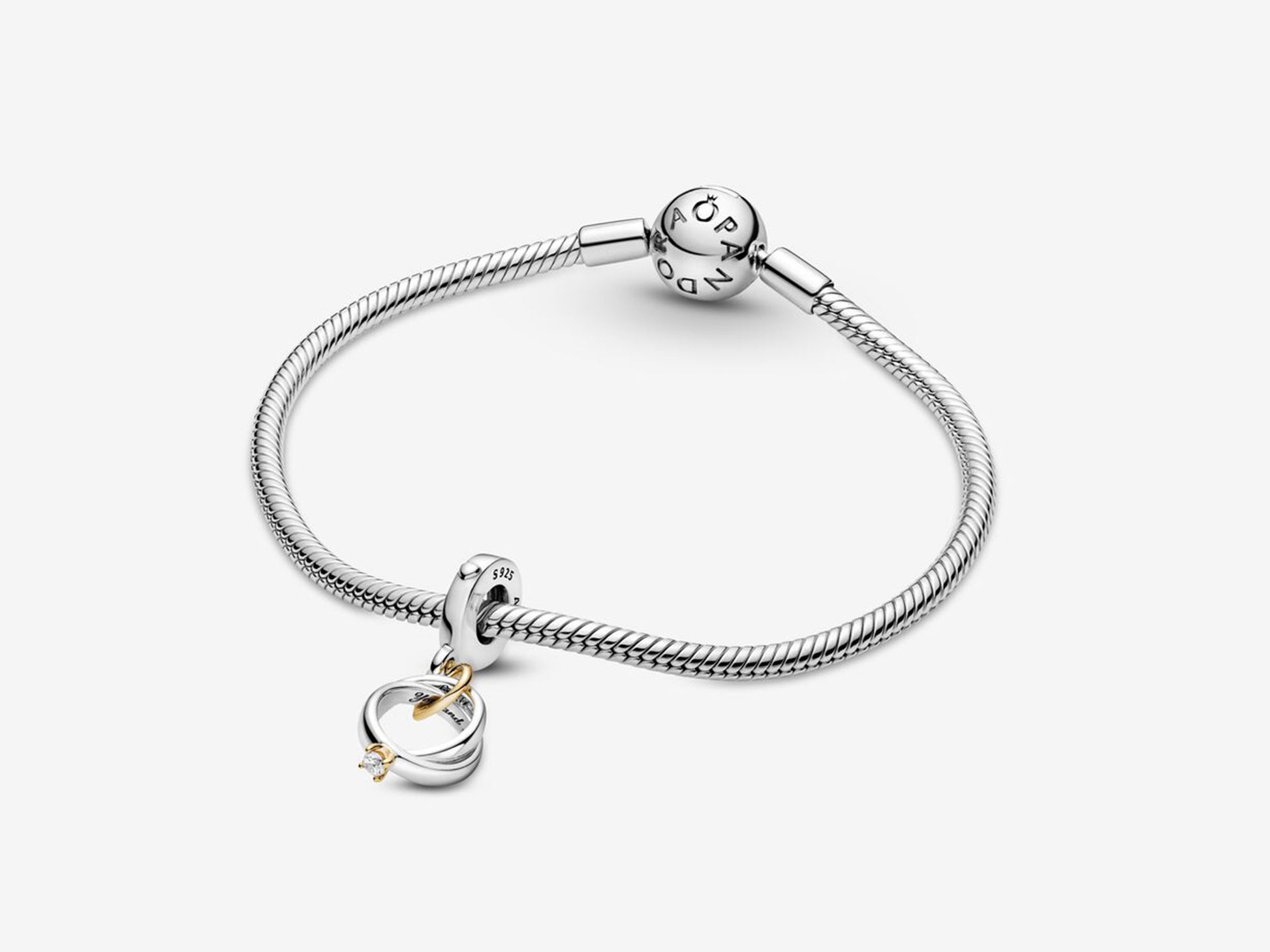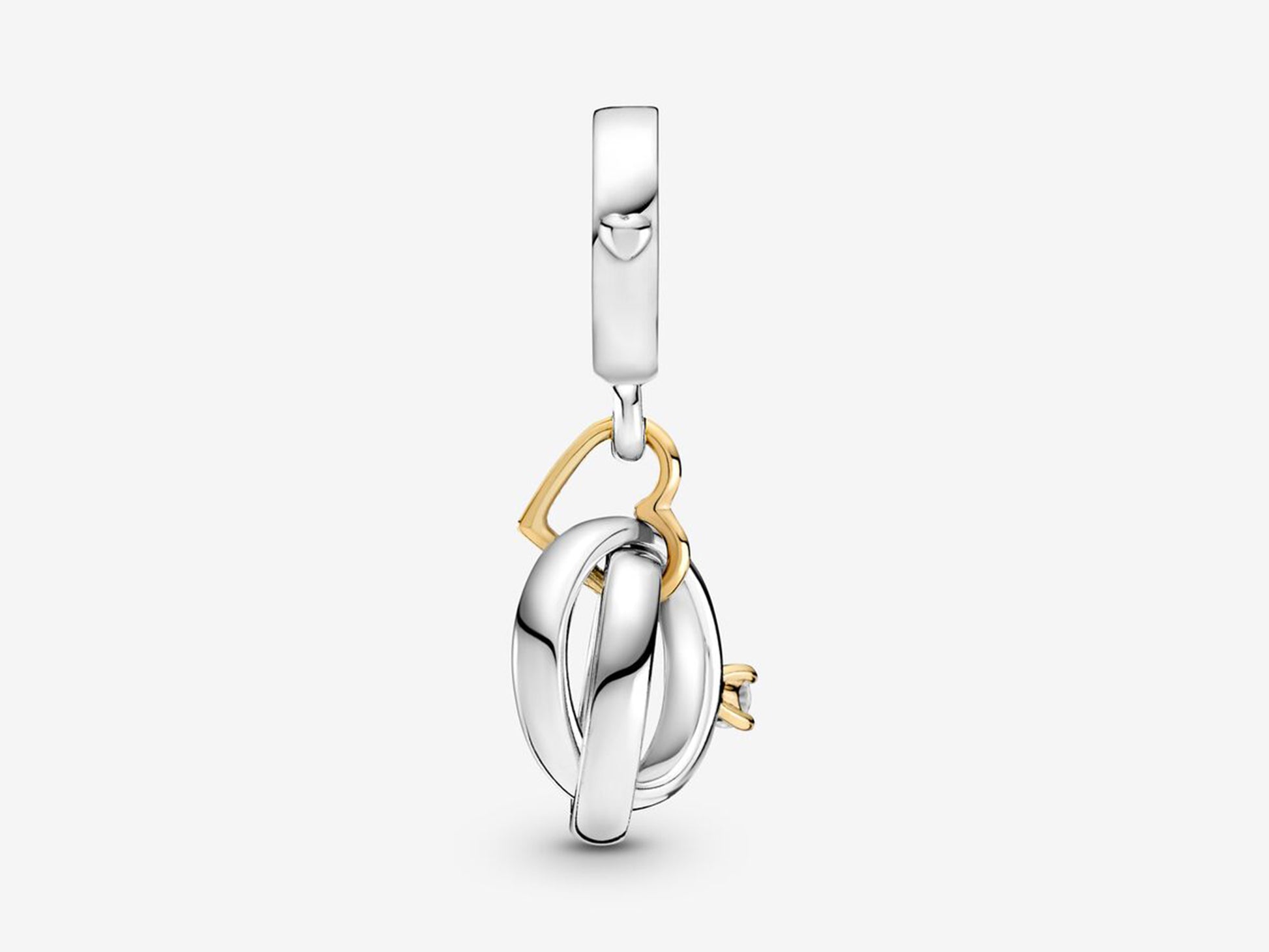 Carry a symbol of forever love with the Two-tone Wedding Rings Dangle Charm. This silver charm features a 14k gold heart link with two entwined rings, one sterling silver solitaire with a sparkling stone set in a 14k gold setting and one sterling silver band. Both feature the engraved messages 'You and I' and 'Forever and always' inside. The bail includes the iconic Pandora logo and two raised hearts. There's no better way to symbolise your love and commitment.