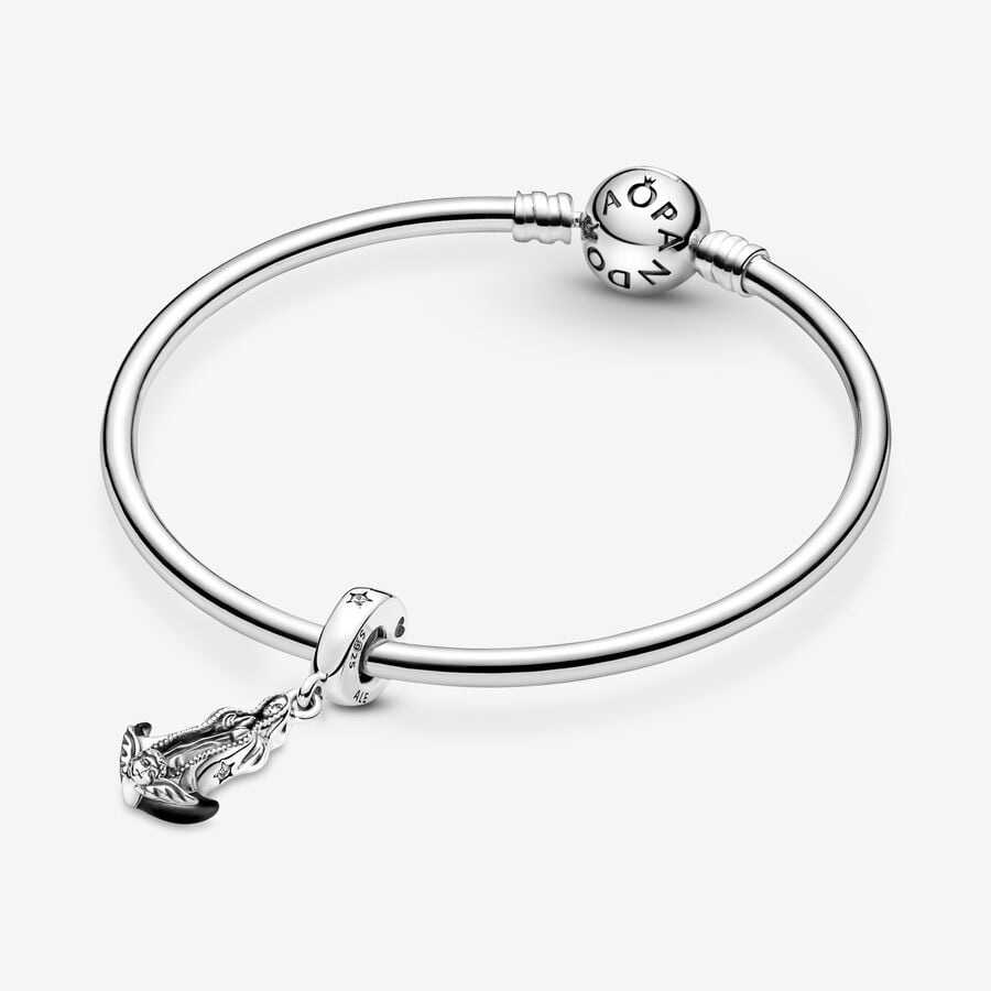Keep your faith close with the Virgin of Guadalupe Motif Dangle Charm. This sterling silver charm features the Virgin, her hands clasped, standing serenely on a crescent moon carried by an angel. Black hand-applied enamel adds a striking touch, while the cloak is decorated with sparkling stones set in stars and small micro beads on the edge. The bail features one stone set in a star on the front, as well as engraved hearts on the sides.