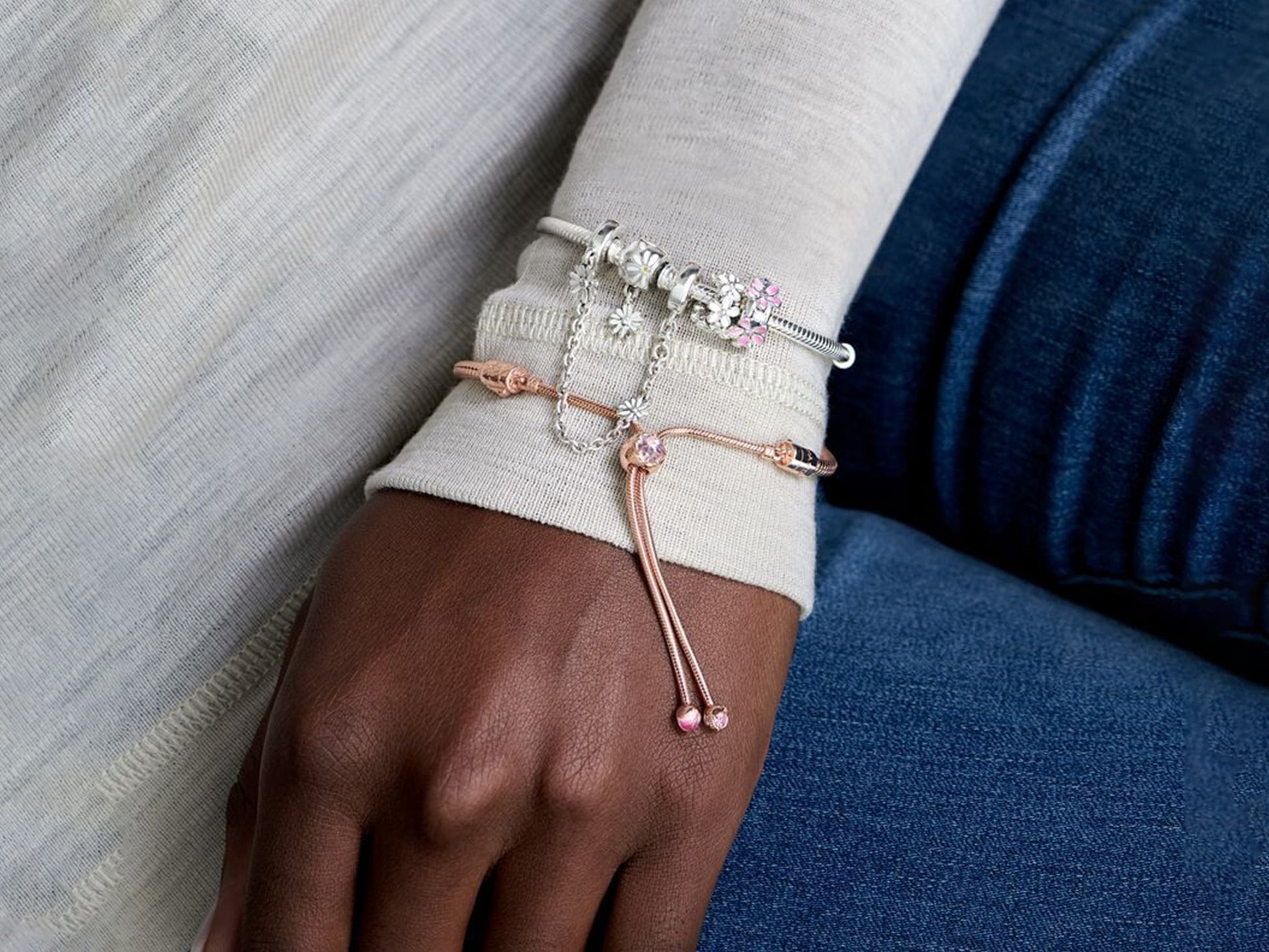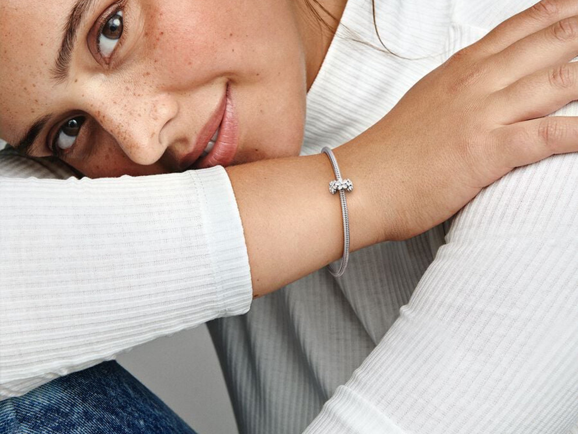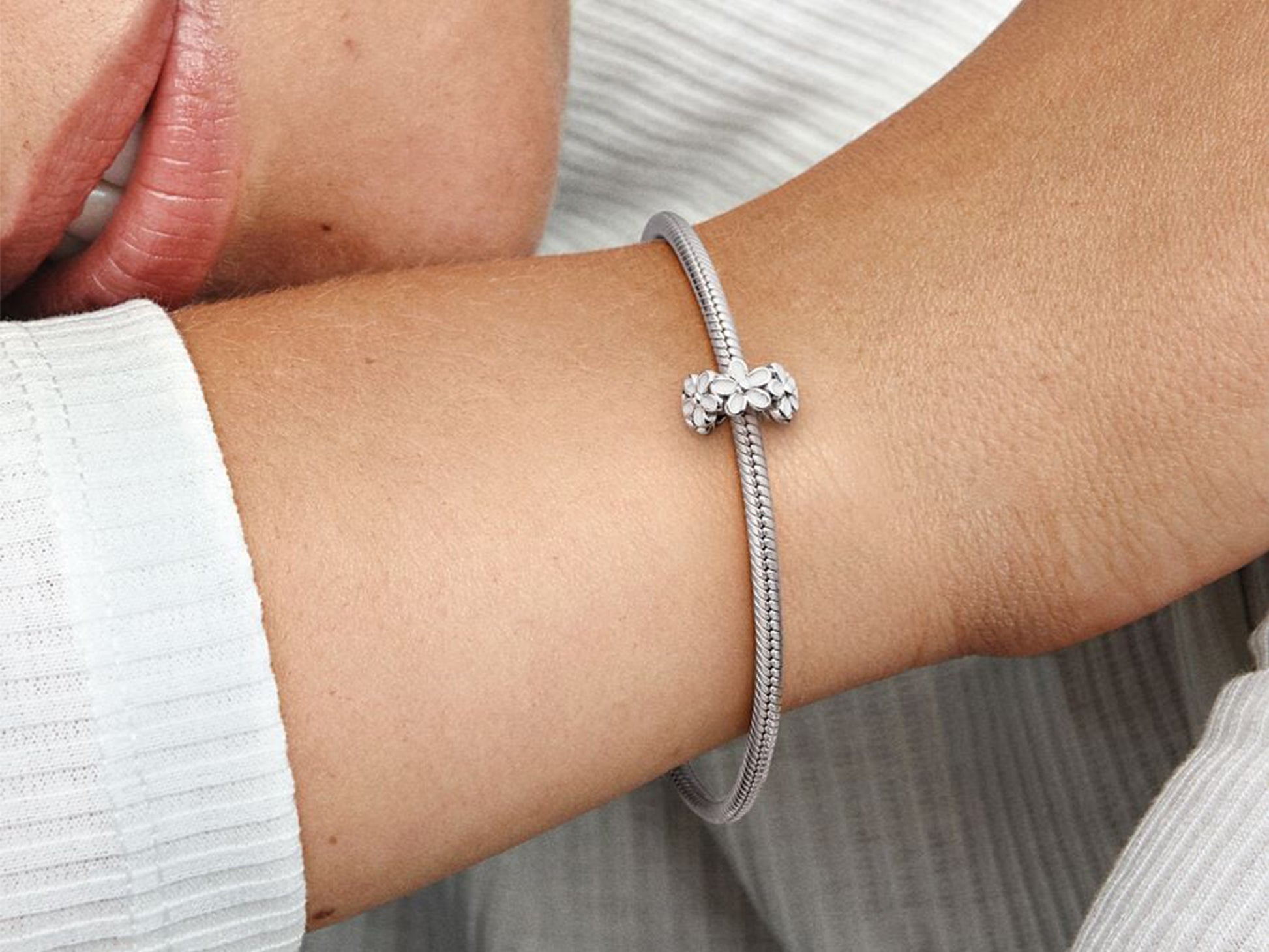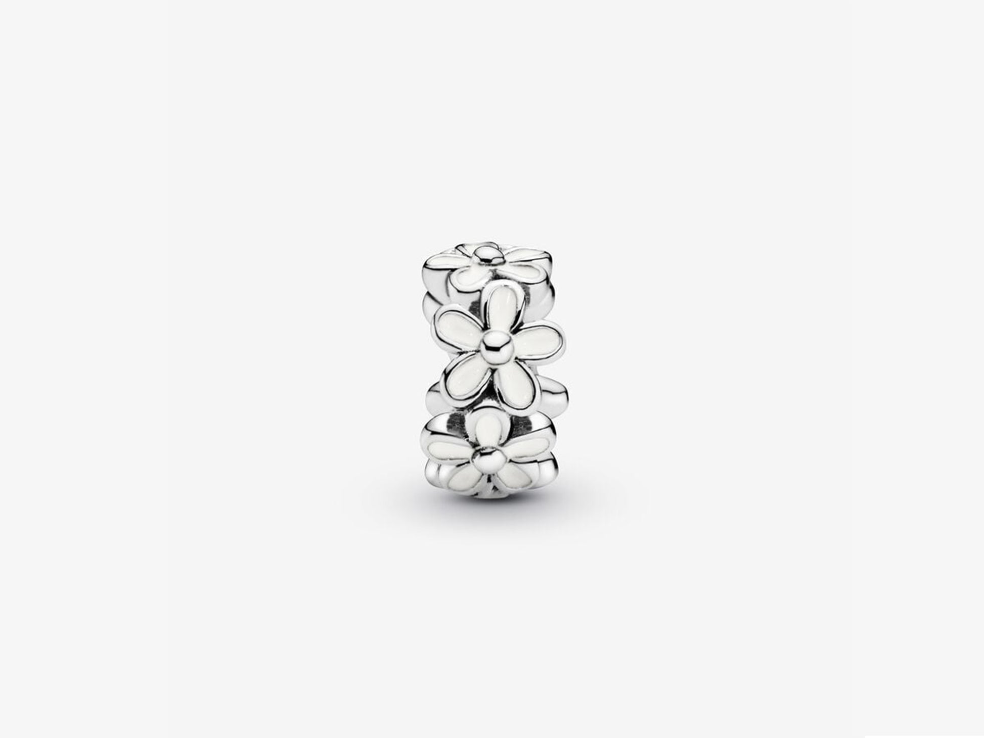 Daisies are a symbol of innocence and purity, freedom and fortitude. Encircled with white enamel daisies in a nod to the popular daisy chain, this pretty spacer charm in sterling silver lends natural appeal to your Pandora Moments bracelet. Add the simple design to your look to represent something you love.