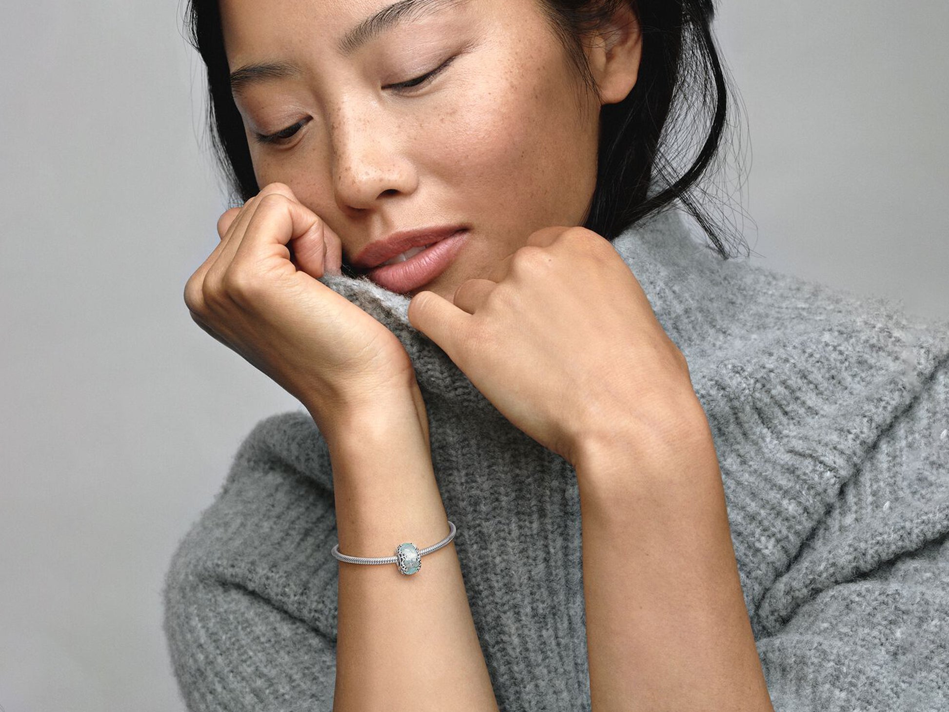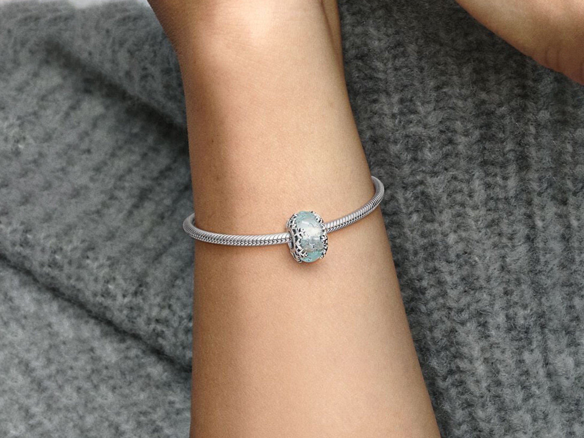 Wear a winter wonderland with the Winter Blue Snowflake Murano Charm. The pale blue frosty effect of this Murano glass charm captures the feeling of looking through the ice of a frozen lake in wintertime. The glass features a mesmerizing frozen water bubble effect, with sterling silver cut-out snowflakes framing the core as if they have just landed on the ice. An elegant addition to a winter-inspired jewelry look. Please note: cracks in the murano glass are intended to show ice cracking effect.